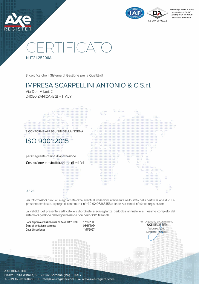 Un ulteriore passo in avanti è stato il conseguimento in data 12/11/2009 del certificato di qualità UNI EN ISO 9001:2008 inteso come capacità di ideare e realizzare un progetto in modo innovativo, che nasce dalla scelta dei materiali, dallo studio di architetture, spazi, particolari di progetto, per arrivare alla realizzazione di opere sempre più complesse. La qualità del prodotto e del servizio offerto alla Committenza è un preciso obiettivo imprenditoriale.